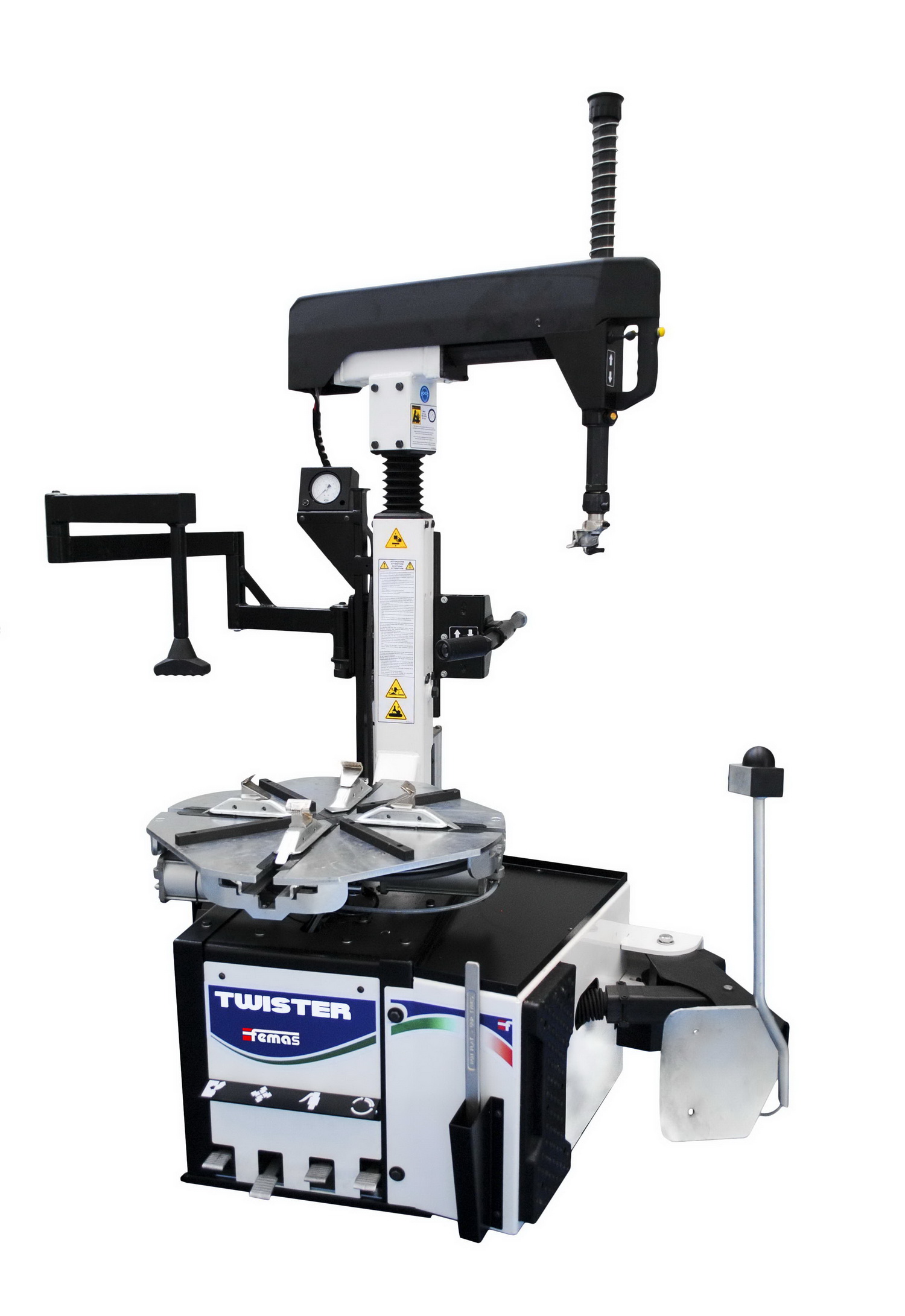 The Twister L-L is an automatic tire changer with Leverless tool which allows the user to abandon the bead lever! It is able to work on rims from 12" to 28". Ideal for cars and light commercial vehicles, it can also operate on UHP tires, low profile tire, run-flat and motorcycles wheels (optional adapters). The Twister L-L tire changer is heavyduty engineered in all its aspects: with its ergonomic profile, the helical swinging of the pole and its Press System arms (option), it is a powerful blend of technology, efficiency and easy handling, thanks also to the patented electric bead breaker.